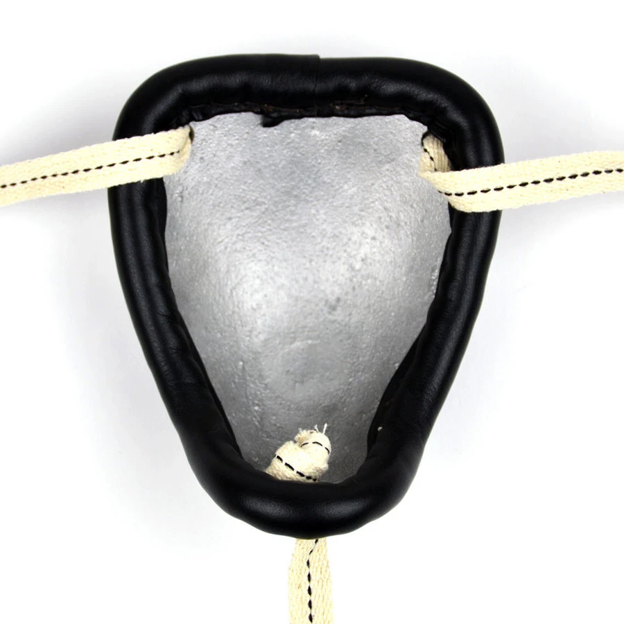 The guard consists of a steel cup encased in leather with soft padding around the edges for comfort.