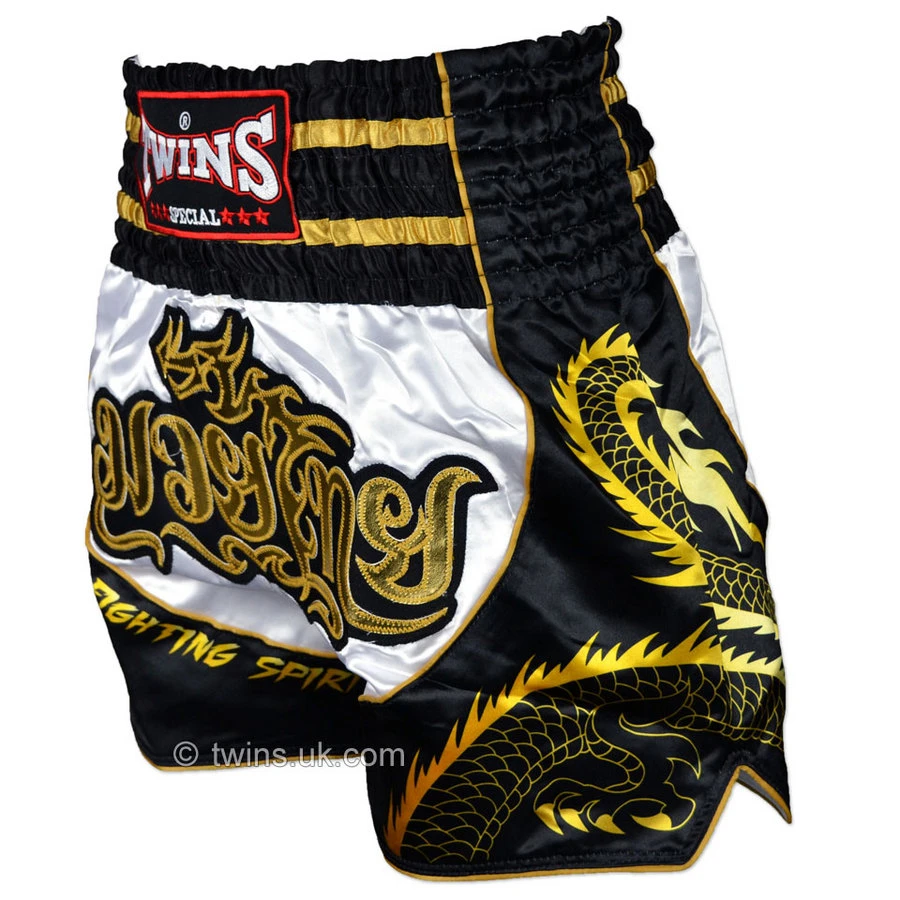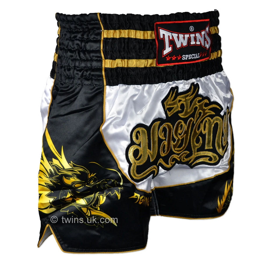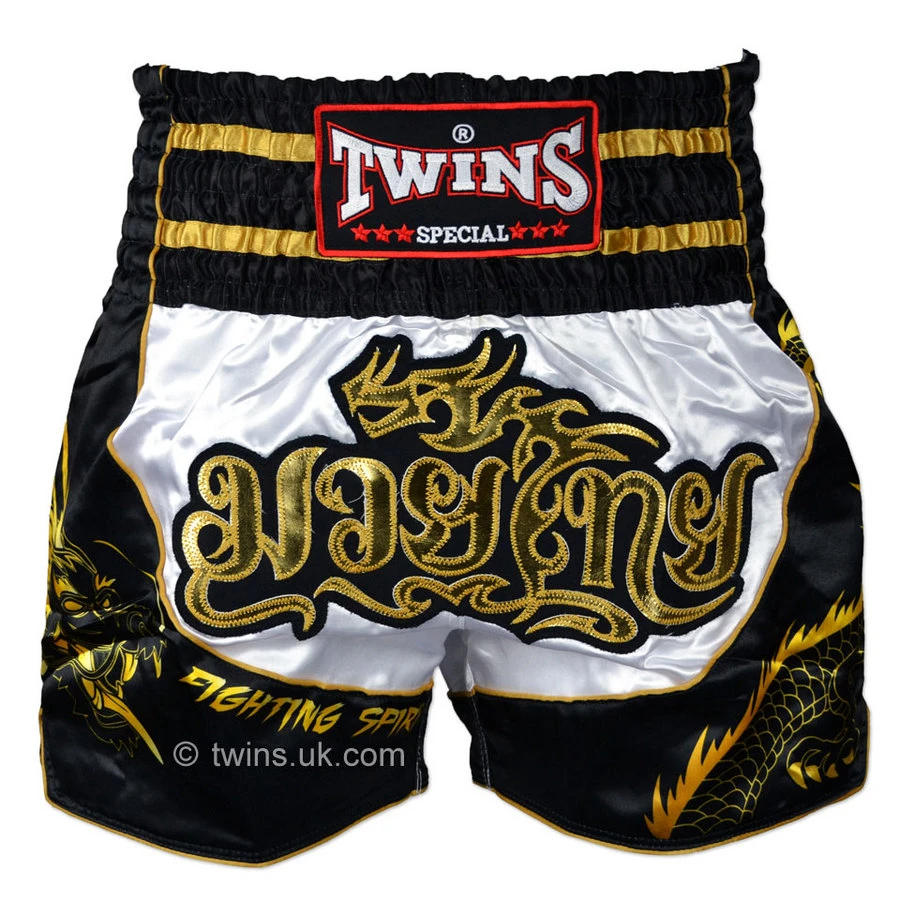 High quality satin Muaythai shorts from Twins Special finished with a very high standard of embroidery and craftsmanship. Sublimated printing technique on the sides that wont fade with repeated washes. Featuring an 8-strip elastic waistband for maximum comfort and a snug fit without restricting movement. Has an inner drawstring for an extra secure fit.